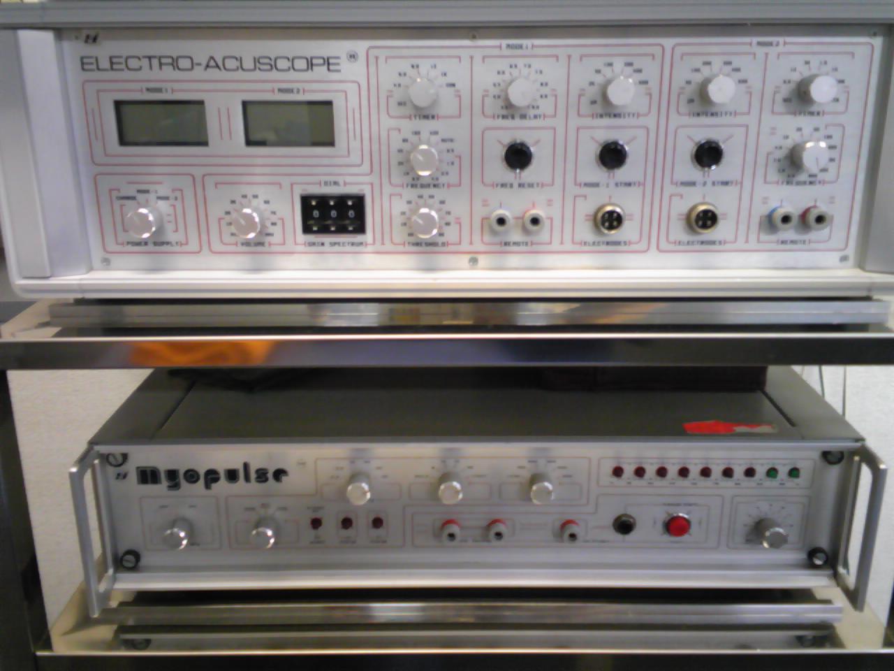 アキュースコープ(上)&マイオパルス(下)という機会です。この電気療法機が従来の電気療法機と違うところは一方的に刺激電流を患部に送るのではなく「相互会話」というシステムを用い微弱電流を瞬時刻々と変化する生体内に送り痛みの緩和とともに組織の修復再生を行うことができます。