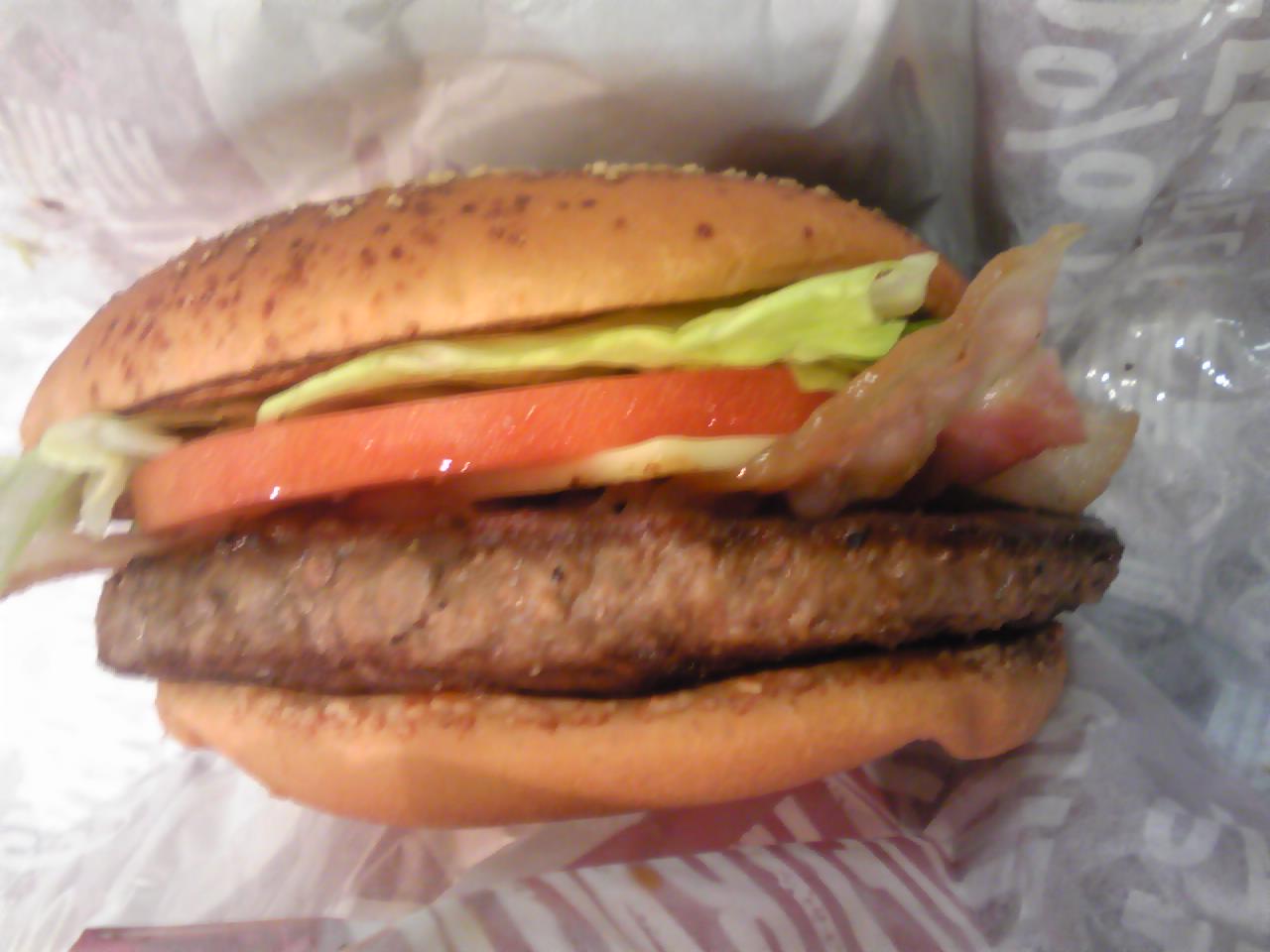 こんなんです。大き目なビーフパティにトマト、レタス、ベーコン、チーズ。一番の特徴はやっぱりソースですかね。カリフォルニア産の赤ワインを使用しているようです(^O^)/