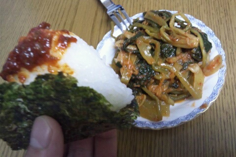 今夜は差し入れでいただいた辛肉みそと韓国海苔にぎりと漬物セット♪