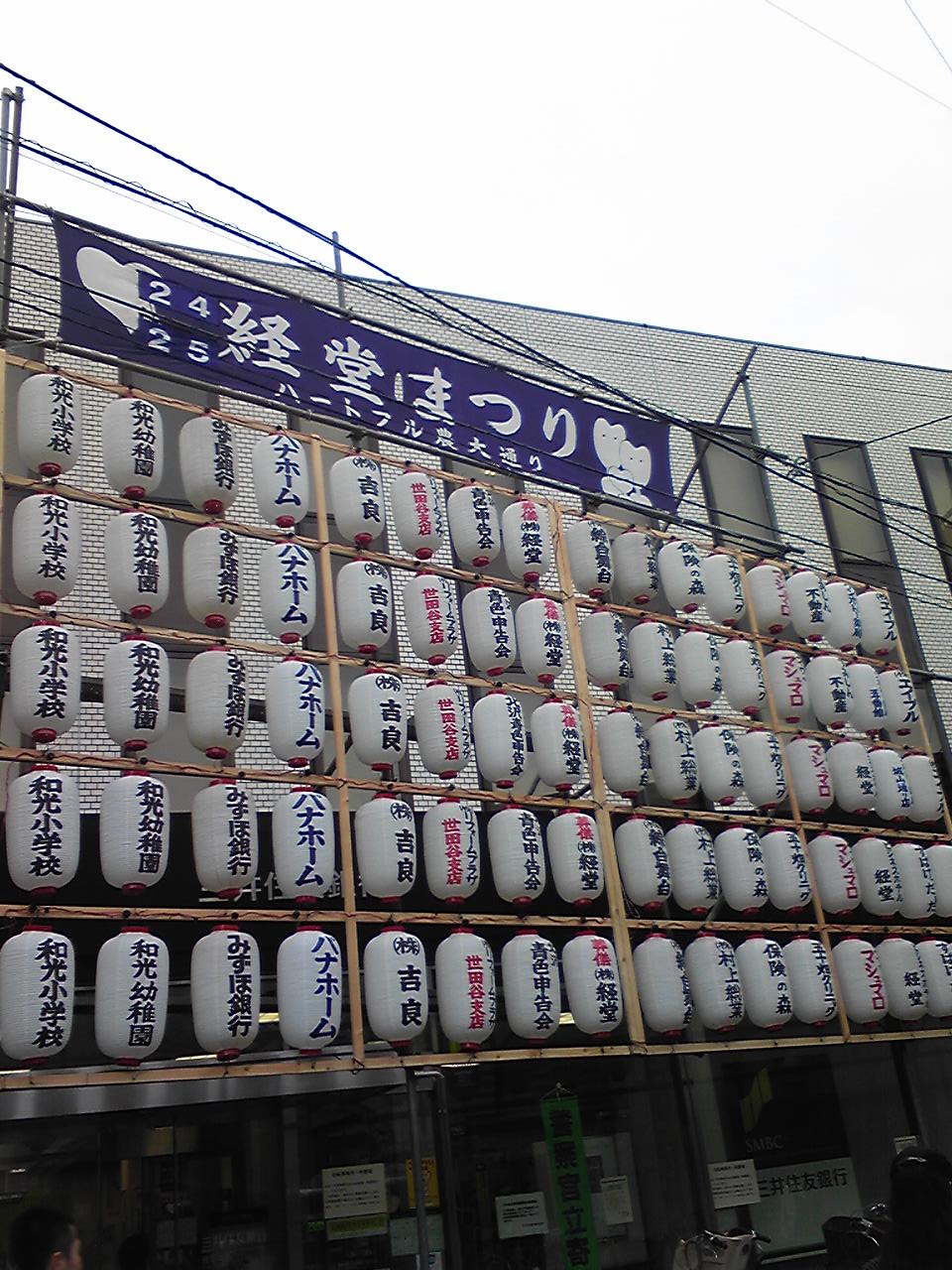 久しぶりに電車で通勤してみると経堂の農大通り商店街の入り口に もう提灯ができてました(^^♪ 経堂近辺にお住まいの方はみんなご存じでしょうが毎年7月に行われる恒例の経堂まつりです♪商店街のお店が出店を出したり近隣の学校のパフォーマンスが賑やかでおもしろい(^O^)今年も楽しみにしています!!