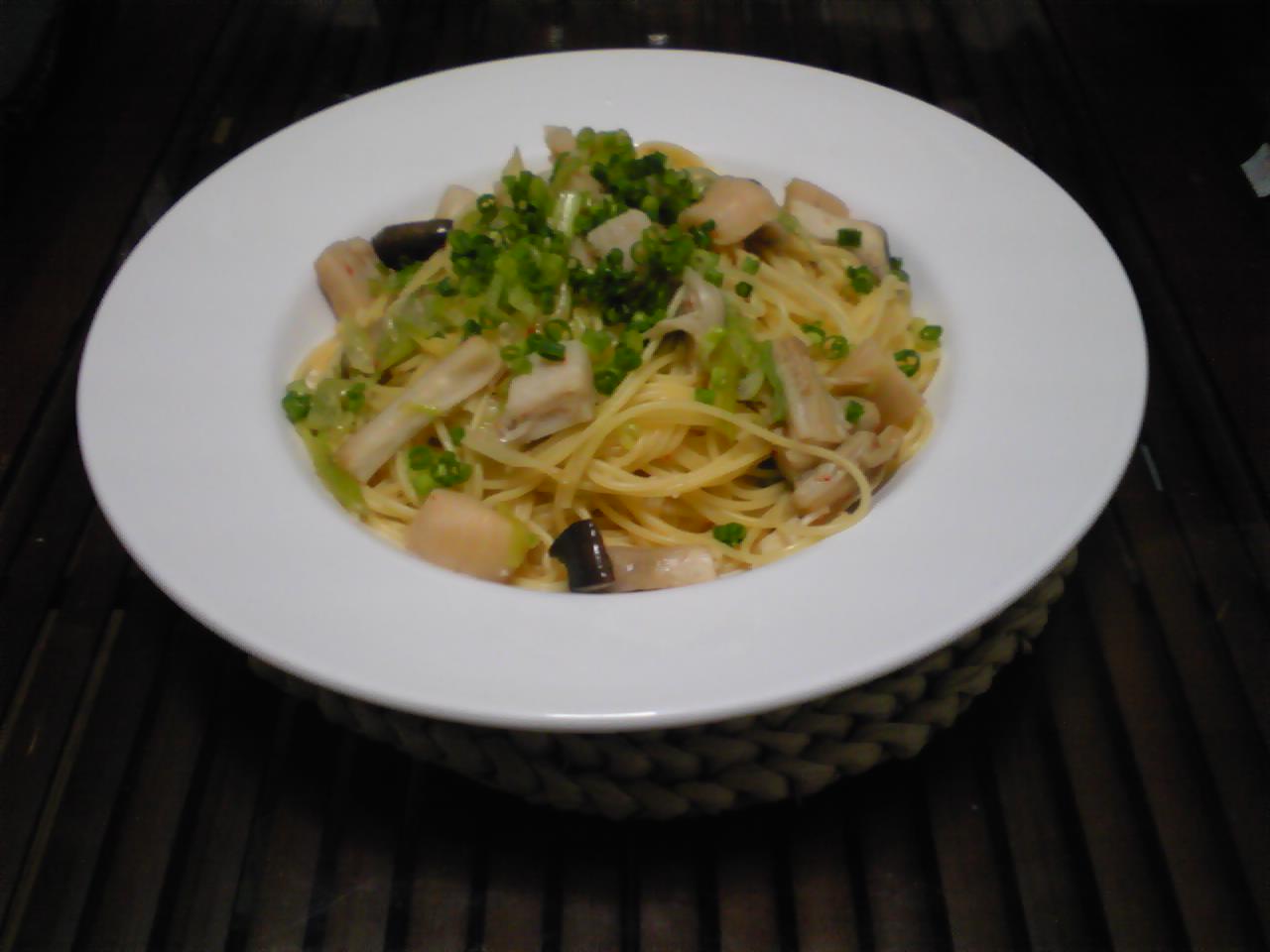 帆立ときのこのピリ辛和風パスタ。なかなか美味しくできました(^^♪