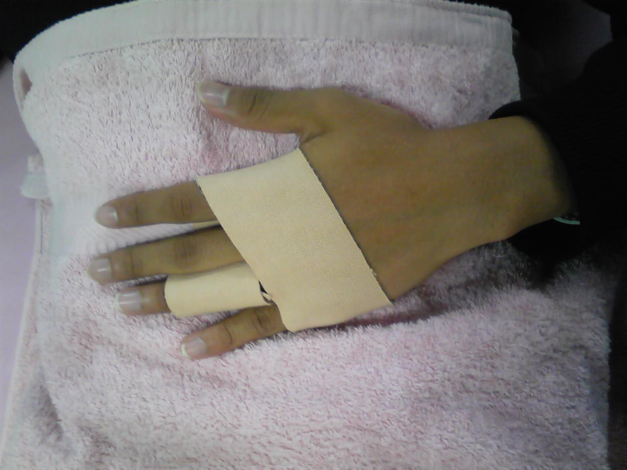 この日はこのまま指にファビリテーションテープを巻いたまま安静にしてもらいアキュースコープをかけました。3日ほど同じように施術をし痛みも改善し指も曲がるように(^_^)v