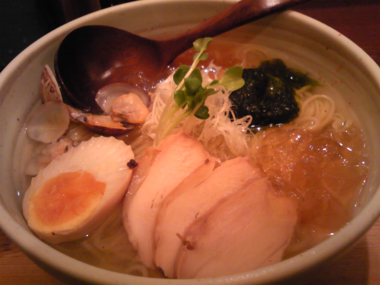 鶏がらベースの塩スープにじょじょに溶けだす魚介ジュレとアサリジュレ。鶏チャーシュー、あさり、煮玉子、かいわれ、海苔とさっぱりながらも食べごたえのある一杯でした(^_^)v