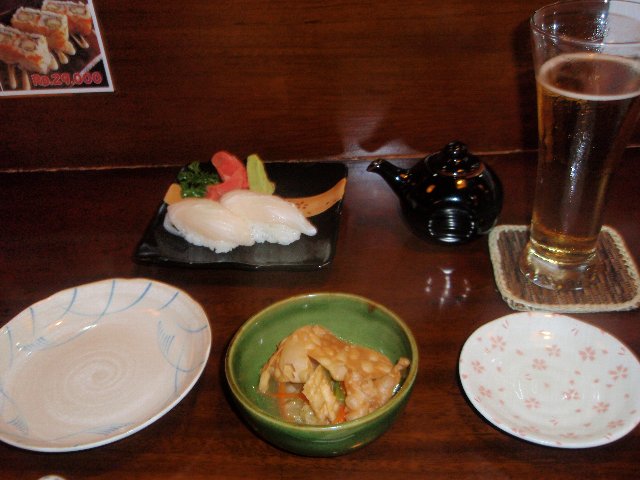 陽が暮れる前に宿を決めようと町中へ。炉端焼きという日本語につられて入ってみることに。生魚は食べても大丈夫なのかドキドキしながら鮨を注文