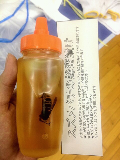今年の新商品、スズメバチのハチミツ漬け。生きたままのスズメバチをハチミツに漬け、もがき苦しみながら毒素を抽出するそうです!Σ( ̄□ ̄;)心筋梗塞、高血圧に効果が期待できるとか…購入してから一ヶ月は食べてはいけないらしい(-o-;)