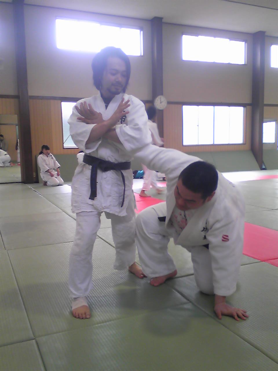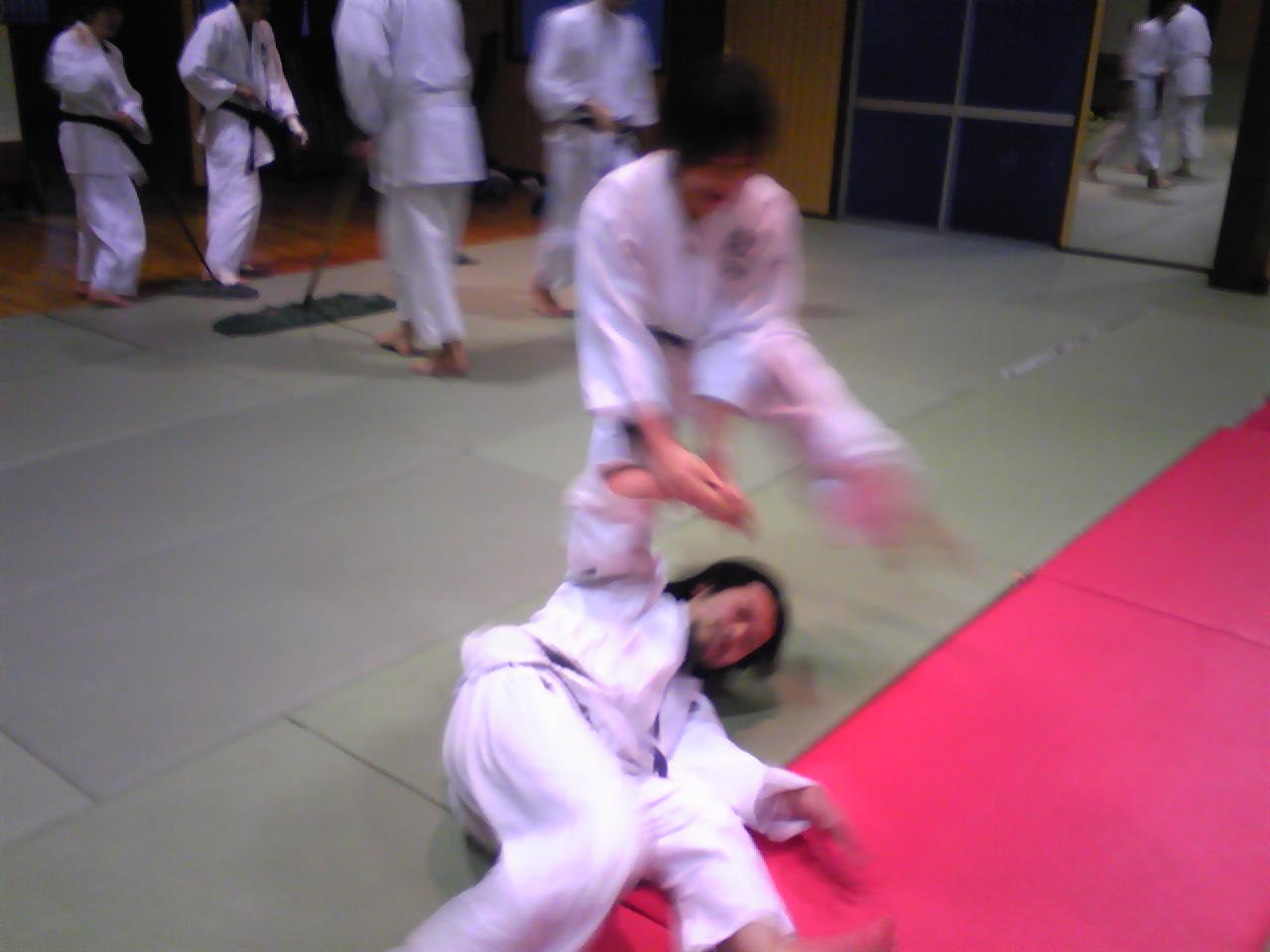次の瞬間こうなります(゜o゜)手関節を極めたまま投げられちゃうんですね。本当は投げられて跳んでいるところを撮りたかったのですが投げが早すぎて撮れないんです(^^ゞちなみにこの写真はtake5くらいです(笑)受け身をとりつかれたのであきらめました。