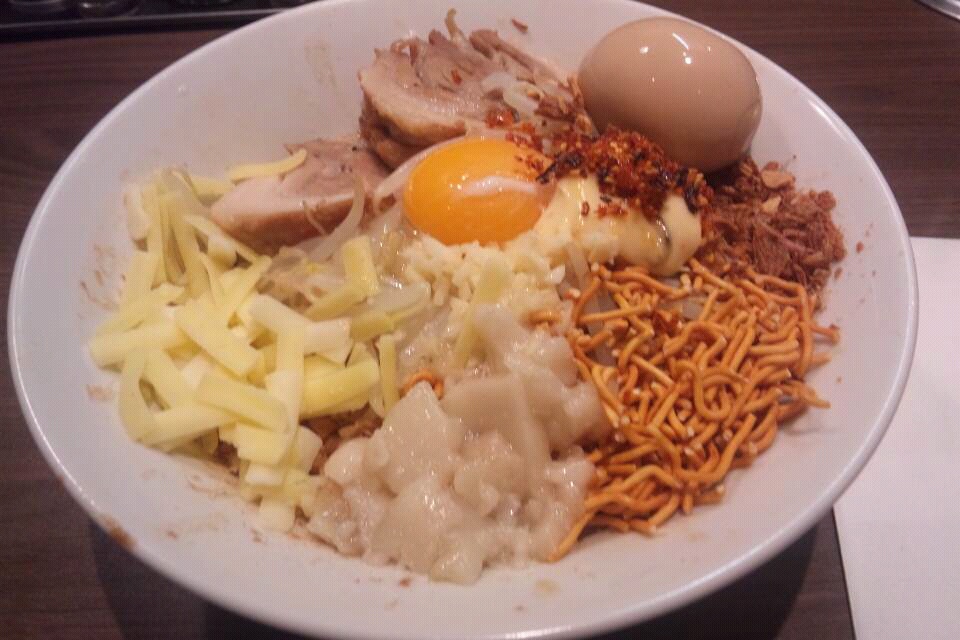東京に帰ってきて、東京駅ラーメンストリートのジャンクガレッジのまぜそば。めちゃくちゃジャンクなB級グルメって感じ(^_^;)