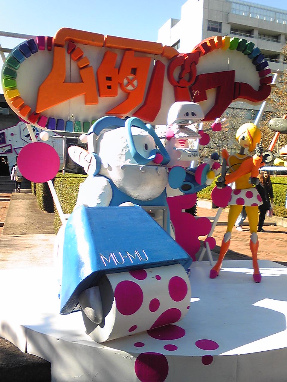 これは武蔵美祭のイメージキャラですかね、近未来的なものがたくさんありました。模擬店もさすが美大というべきかかわいいカフェだったり立ち飲み屋風のお店がたくさんありました!!展示作品も素晴らしかったですしフリーマーケットも学生の手作り作品があり楽しめました♪