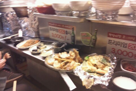 マッコリ、豚足、チャプチェ、キムチ、キンパプ、オデンを腹いっぱい食べて30000ウォン♪安いっ(*≧∀≦*)