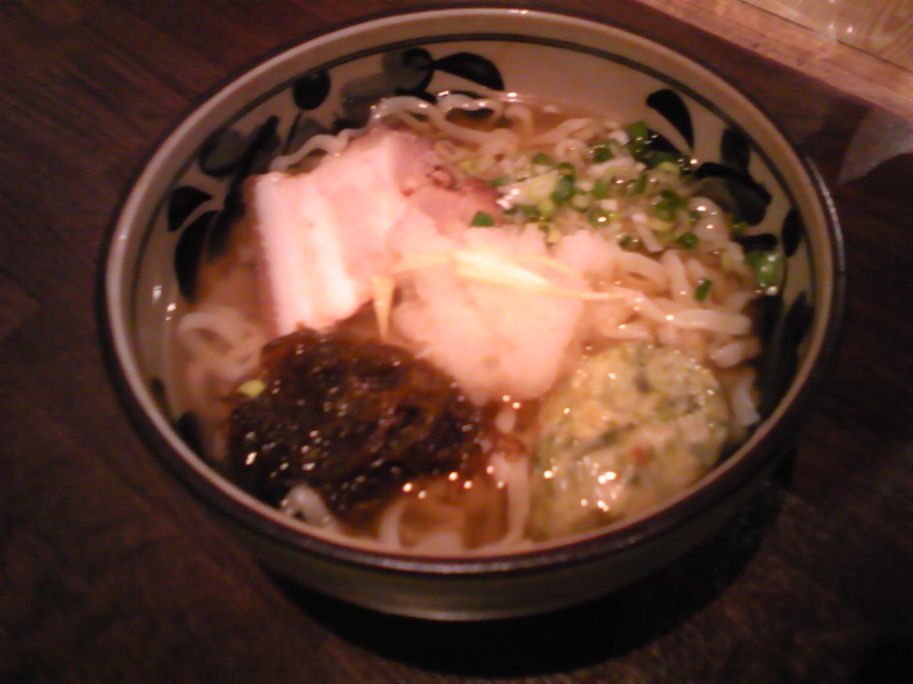 冷たいスープにもずく、ねぎ、アオサのちくわ?しょうが、三枚肉がのっておりとってもさっぱり(^u^)コーレグースを少したらしていただきました(^^♪