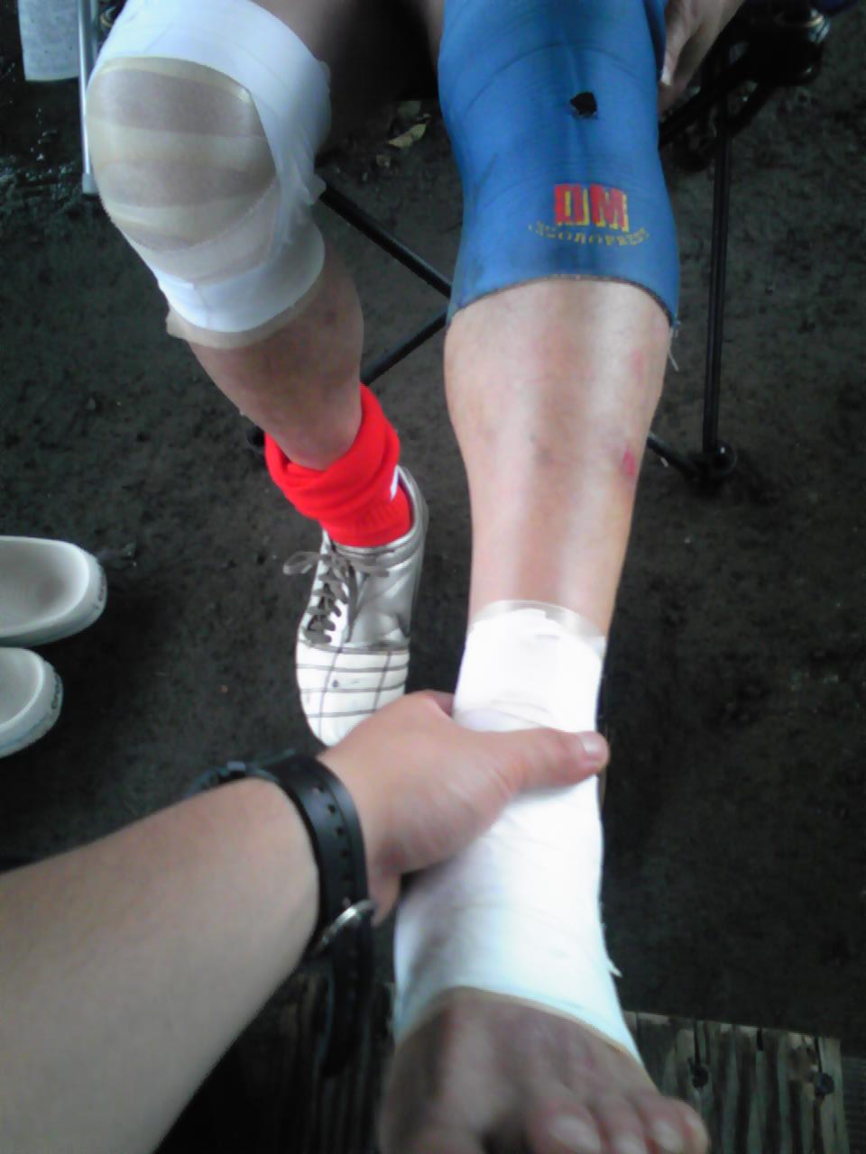 私はFC1979というチームのスポーツトレーナーとして参加。試合前にテーピングで怪我の予防につとめます。