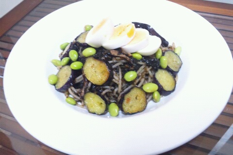 イカスミ…ではなく、海苔の佃煮と茄子の和風パスタ。