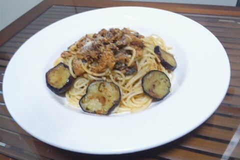 茄子のボローニャ風ミート…ではなく、茄子と鯖の味噌煮の和風パスタ。