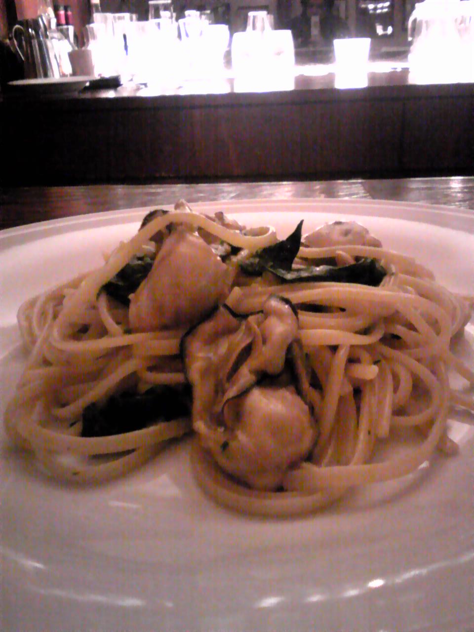 続いてパスタ。牡蠣と寒じめほうれん草のリングイネ。ちょうど良い火のとおり具合でぷりぷりの牡蠣と野菜の味のつまったほうれん草がオイルとからまり絶妙の風味を醸し出してくれます。