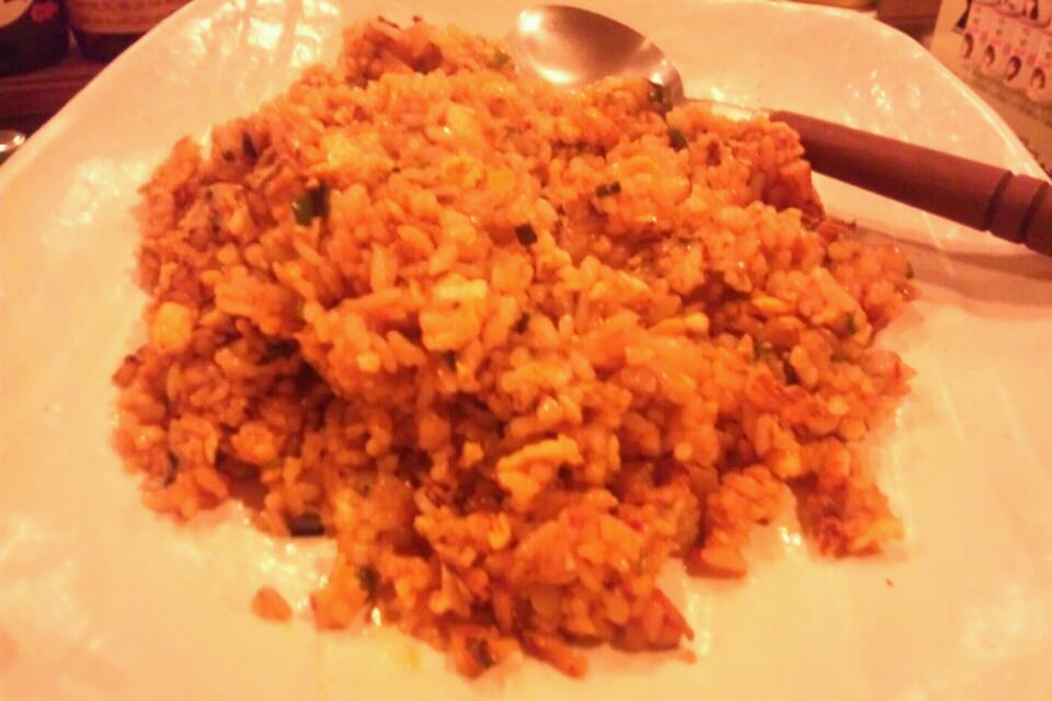 コプチャーハン。コプチャンの入った炒飯。辛味の効いた炒飯にコプチャンの甘味があいます(*≧∀≦*)