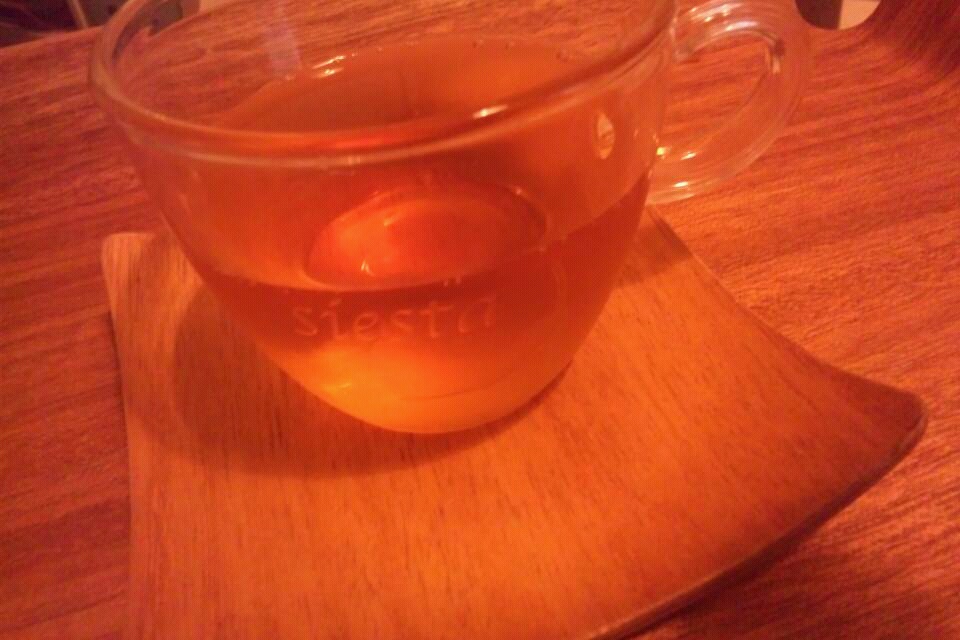 暖色系の心落ち着く色使いの部屋でシエスタのロゴ入りカップでお茶をいただいて、一息♪